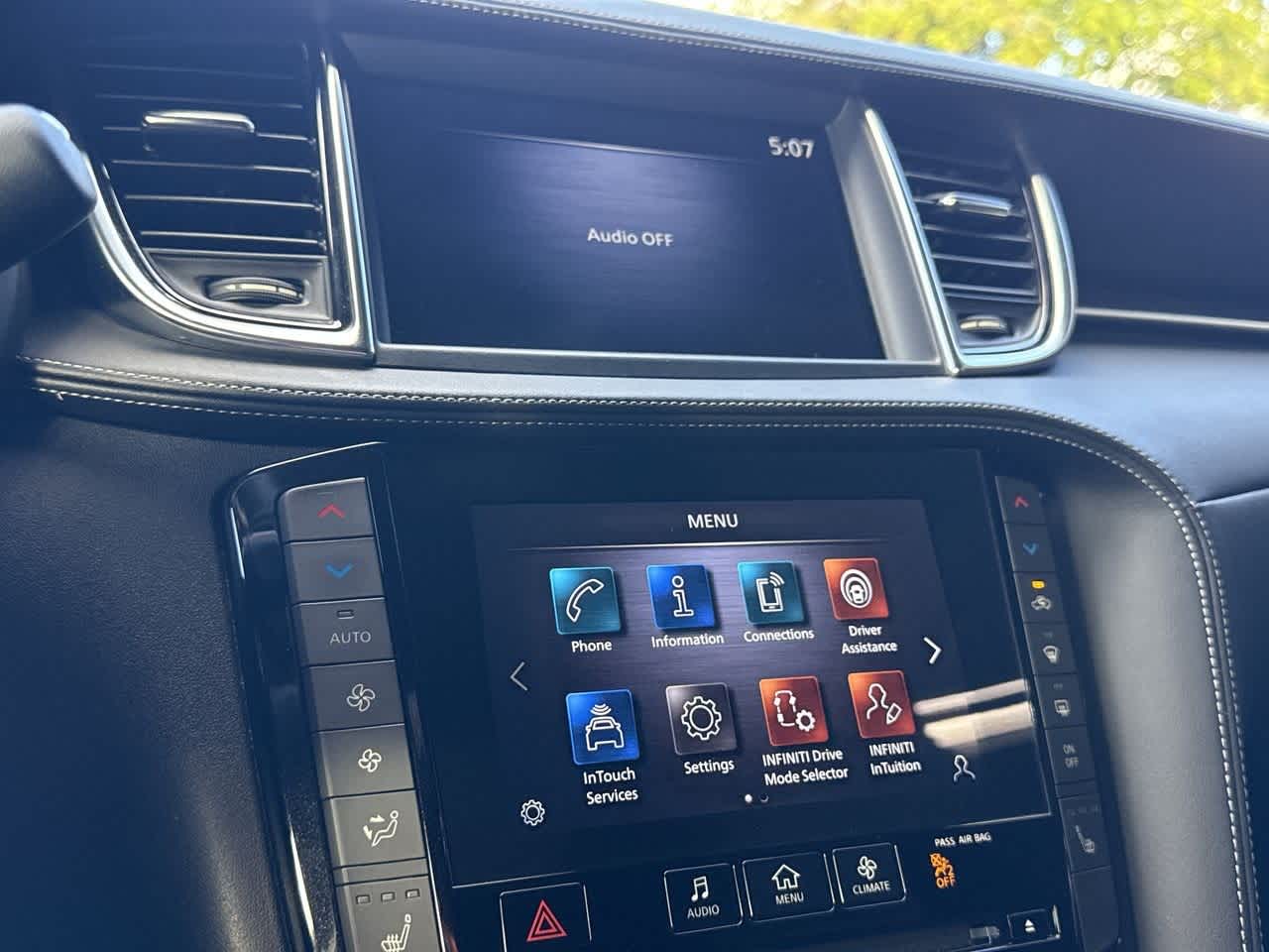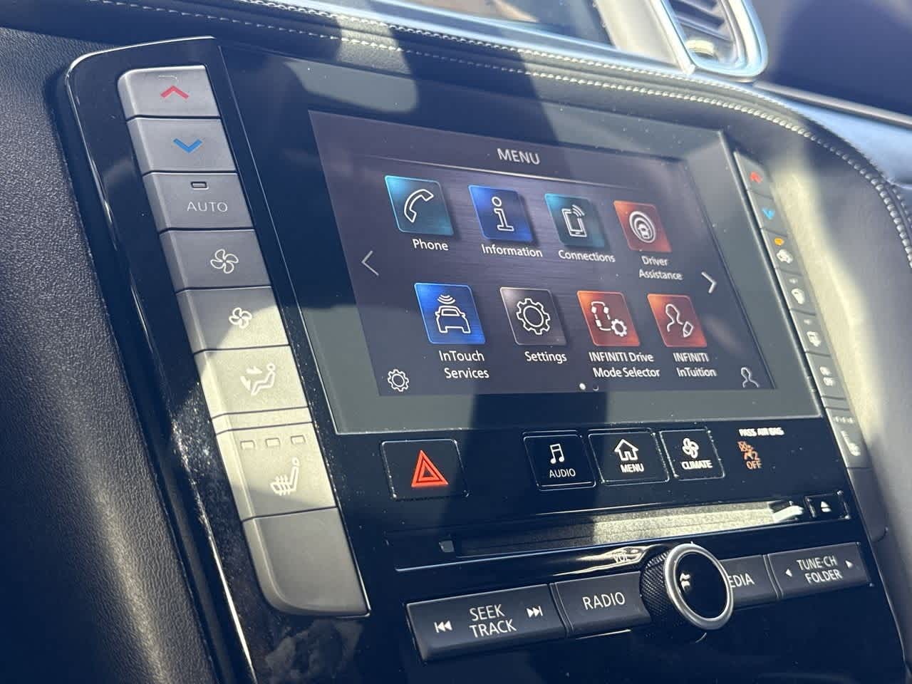 - Radio: HD Audio System -inc: INFINITI InTouch, INFINITI InTouch services, INFINITI InTouch dual display system w/upper 8" and lower 7" HD touch screens, wireless Apple CarPlay, Android Auto, HD radio technology, SiriusXM radio w/advanced audio features and 90-day complimentary trial, INFINITI voice recognition, Siri Eyes Free, Wi-Fi hotspot and active noise cancellation